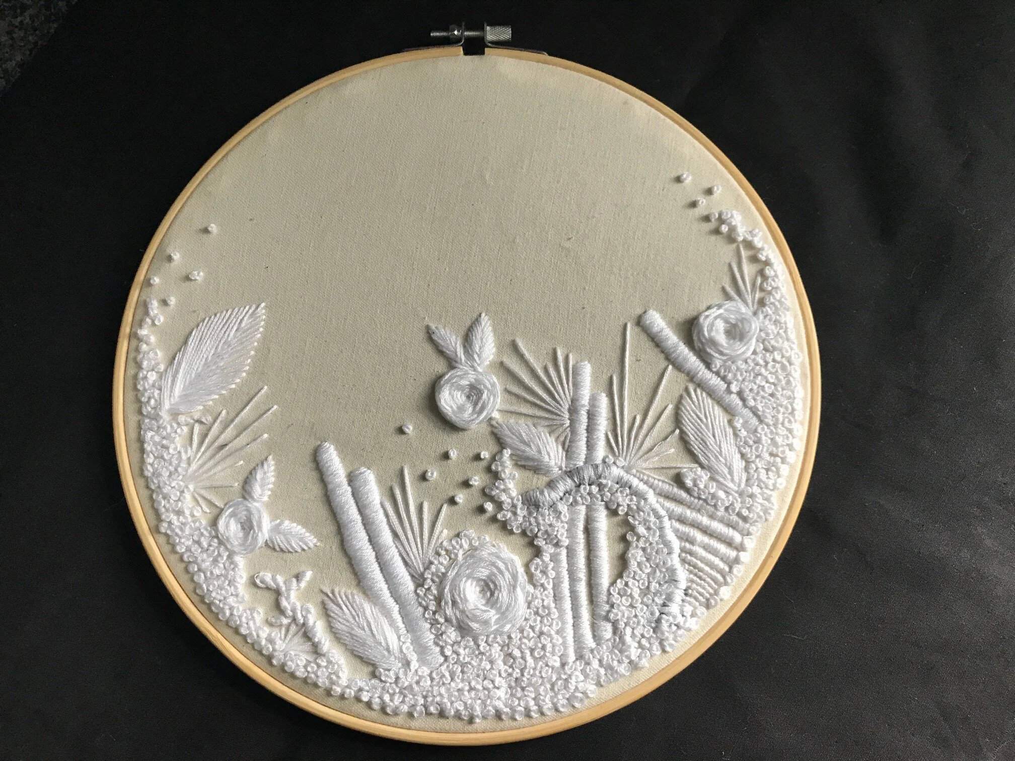 Feather Hoops, Hand-Embroidery on Muslin, 3” each
